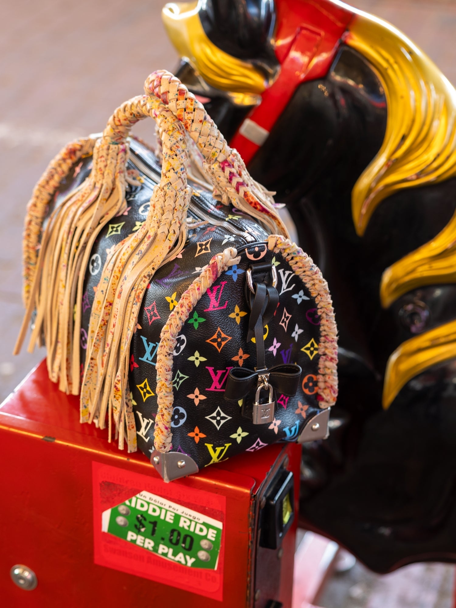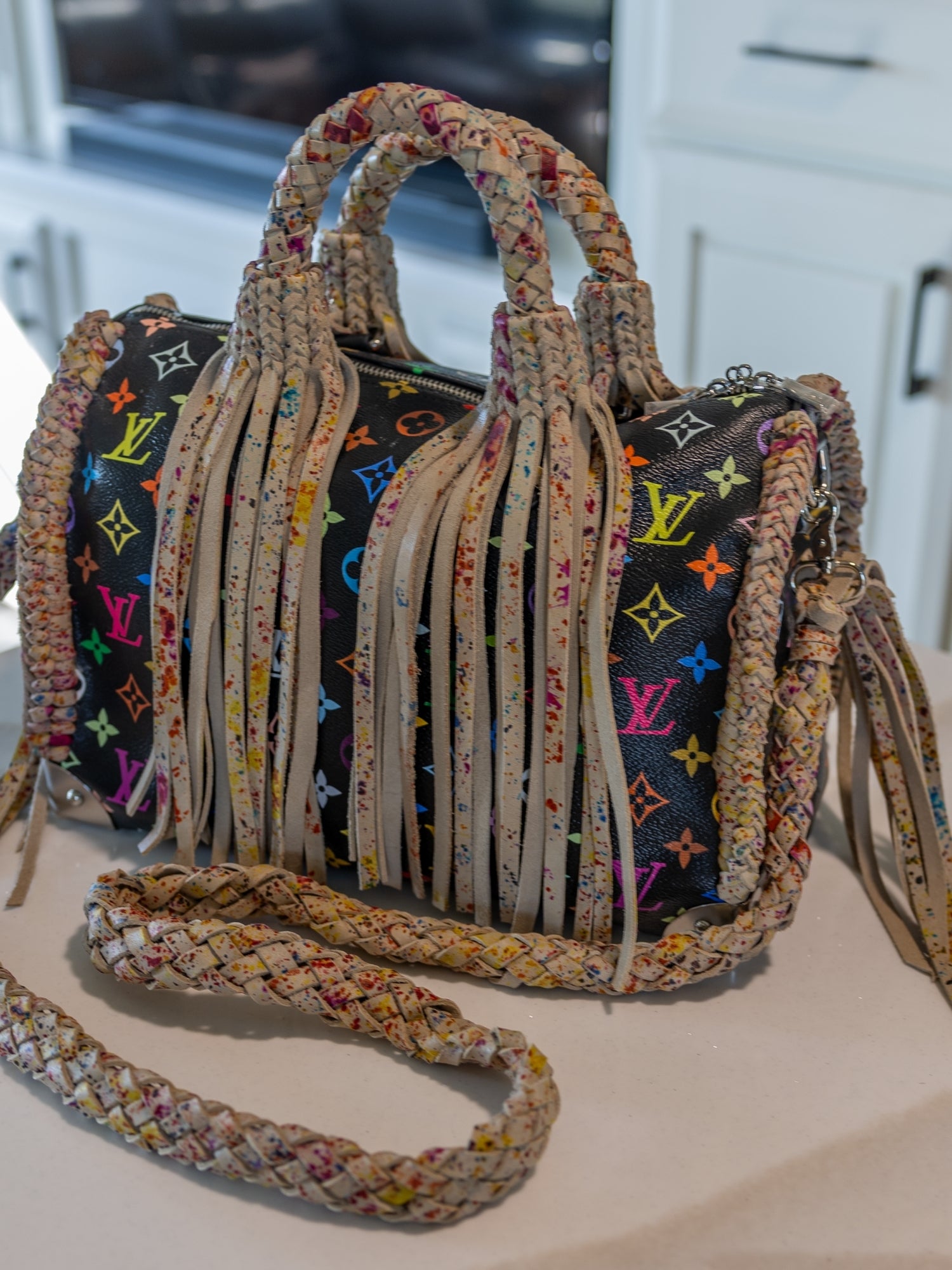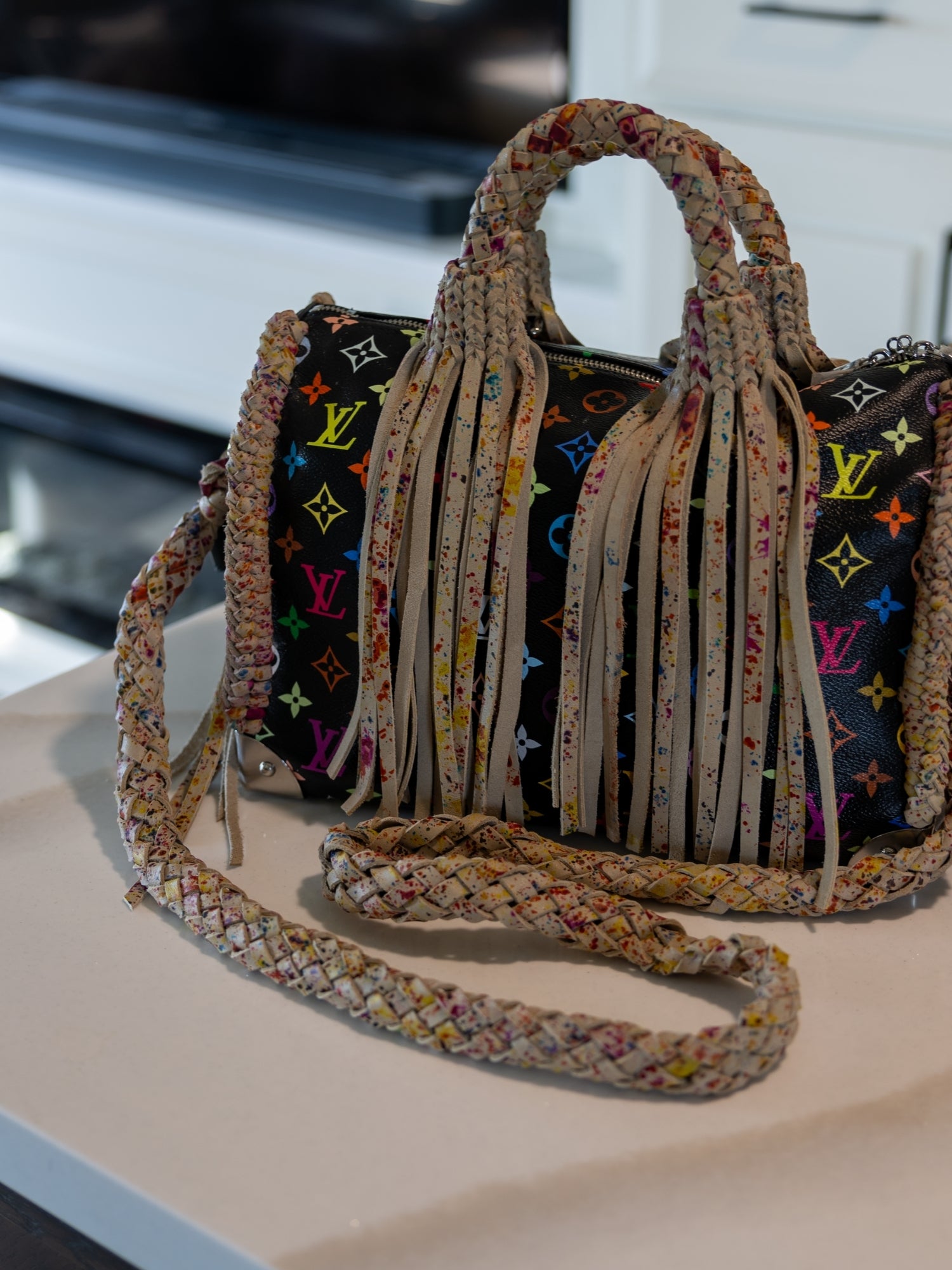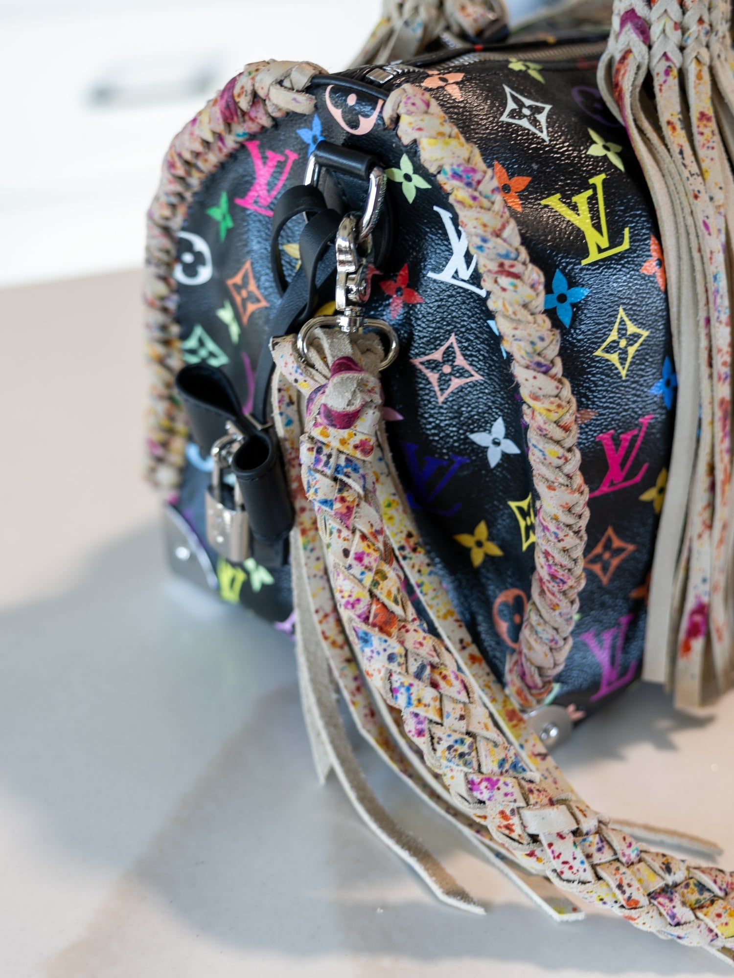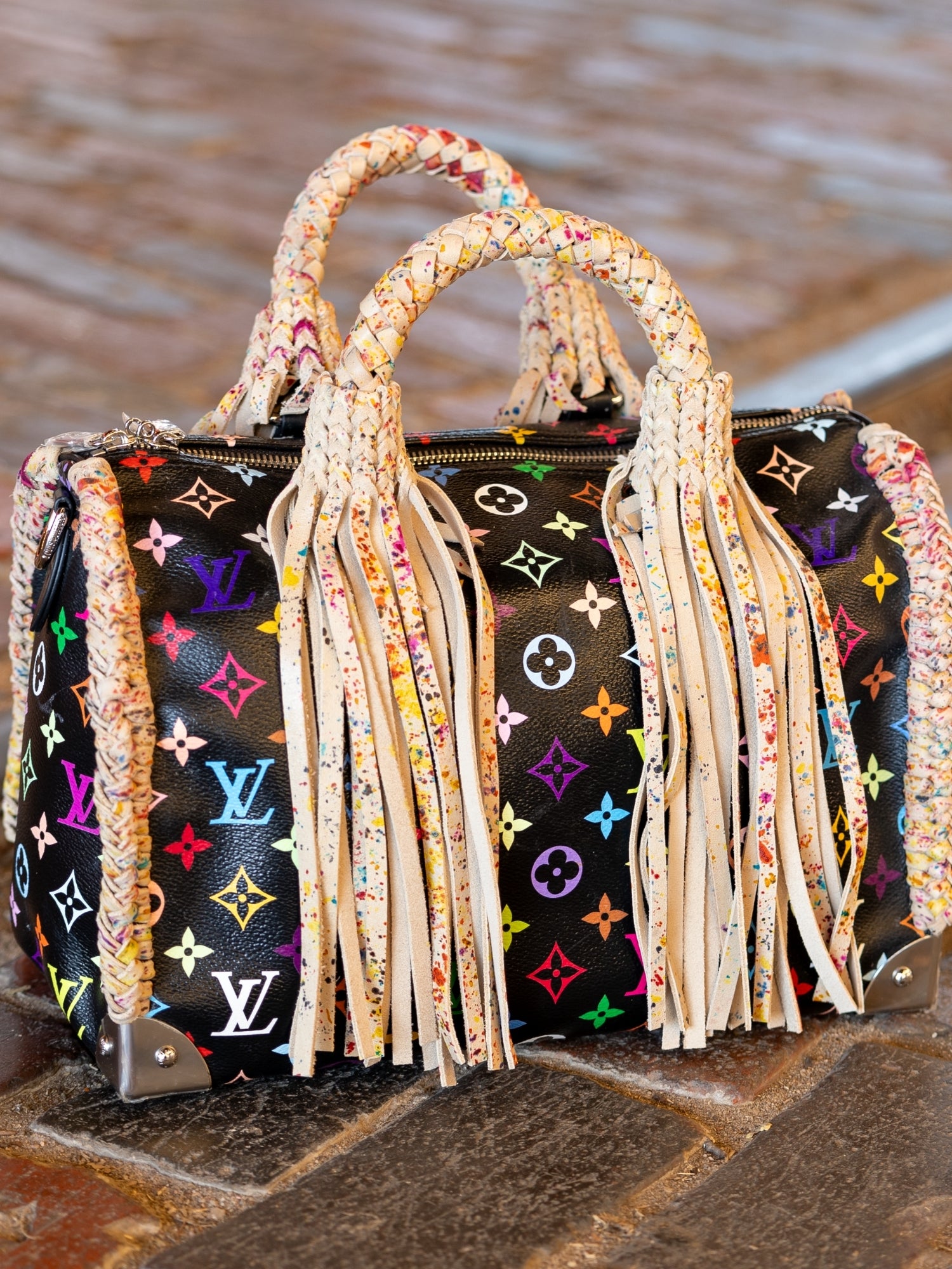 Art, heritage, and craftsmanship in perfect balance. The Collector is a limited-edition Murakami Speedy 30 reimagined with hand-painted splash-pattern leather and high-end detailing throughout. Every brushstroke and braid reflects hours of artistry, from the premium leather fringe to the dual strap design—braided crossbody and solid shoulder length. Created as a one-of-a-kind statement for the discerning collector, this piece embodies the essence of Native Refined: bold craftsmanship with timeless sophistication.