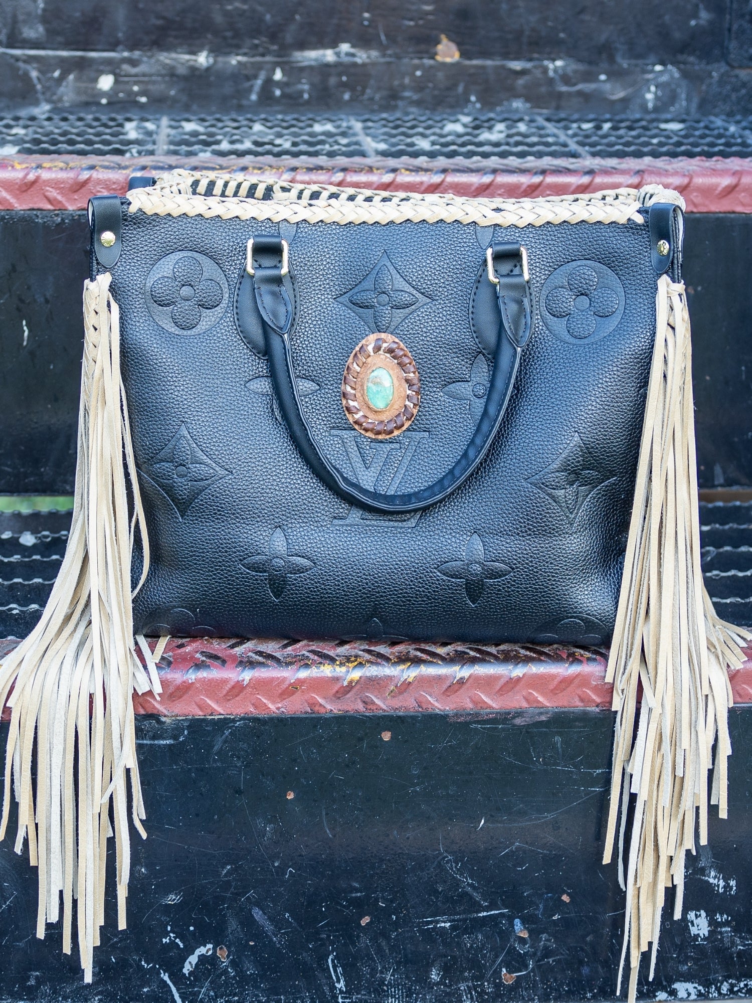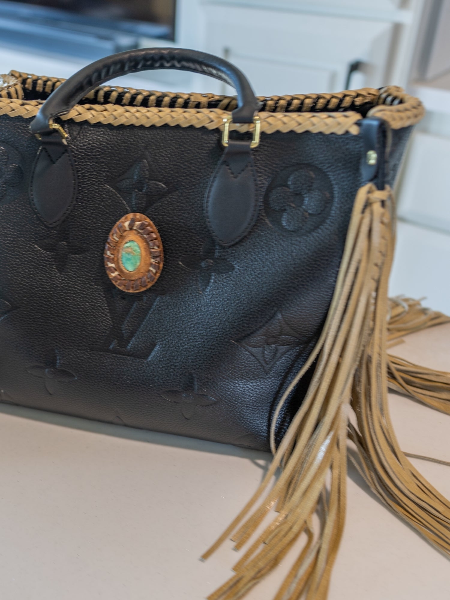 Classic strength, soft sophistication. The Frontier is a statement OnTheGo MM featuring cream-gold lambskin fringe that flows with every step and a turquoise center stone for a touch of Western soul. Finished with an additional shoulder strap for versatility, this one-of-a-kind piece bridges timeless craftsmanship with modern Texas elegance.