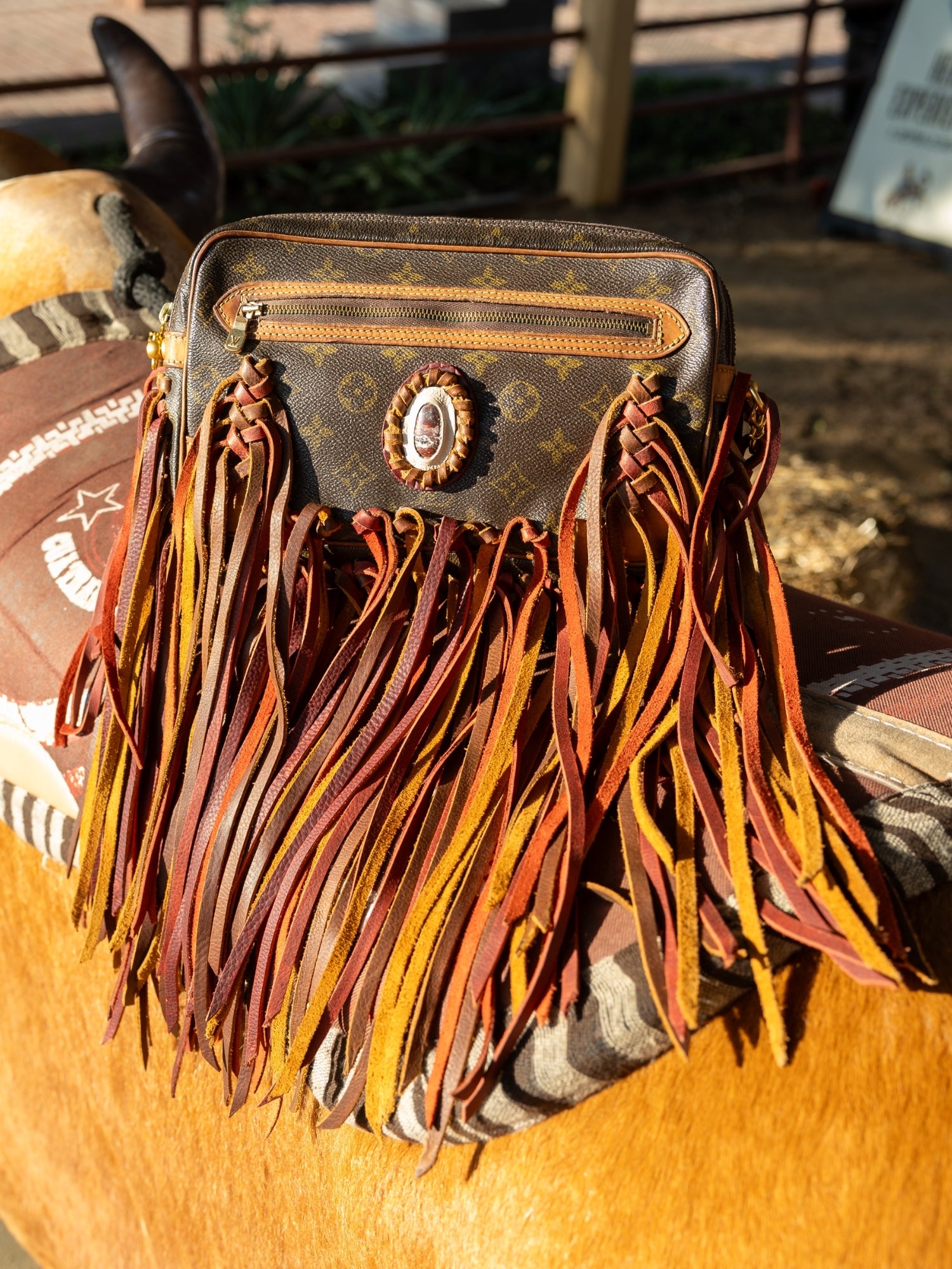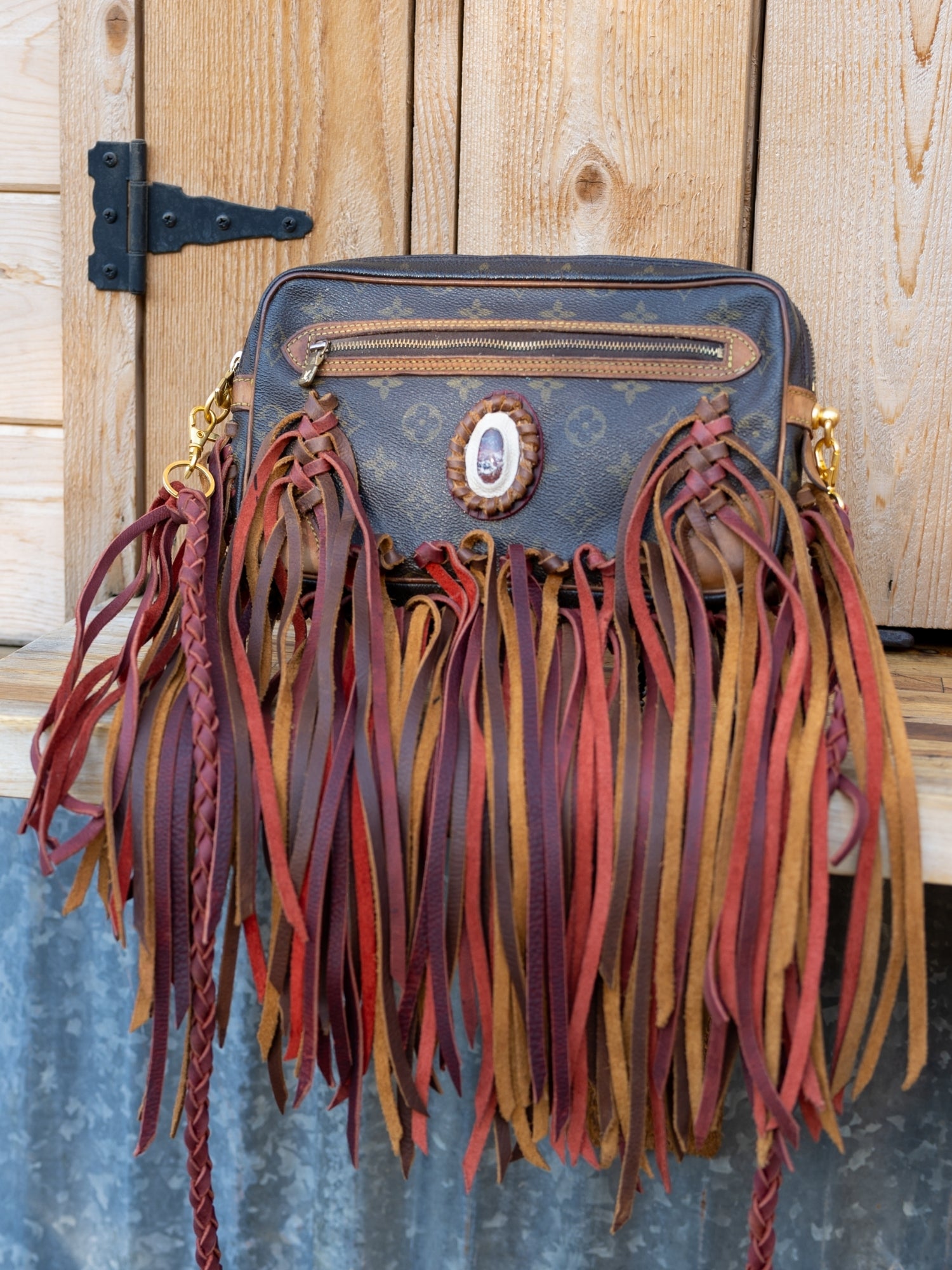 Wild at heart, refined by hand. The Outlaw crossbody blends rugged texture with elevated detail. Its mix of red and brown leather fringe adds depth and movement, centered by a handcrafted stone accent. Finished with both a braided crossbody strap and matching wrist strap, this piece transitions effortlessly from day to night with Western edge and artisan craftsmanship.