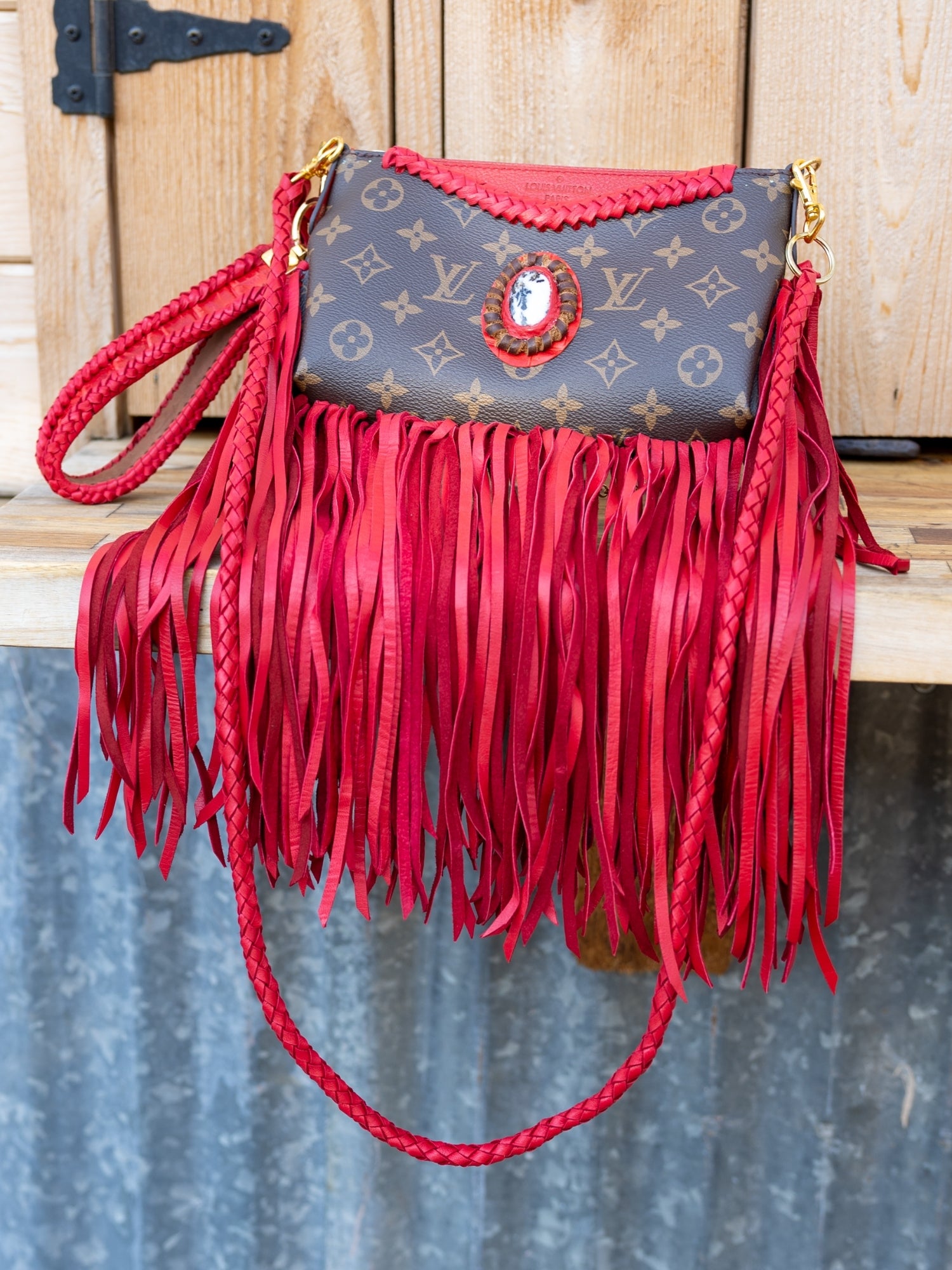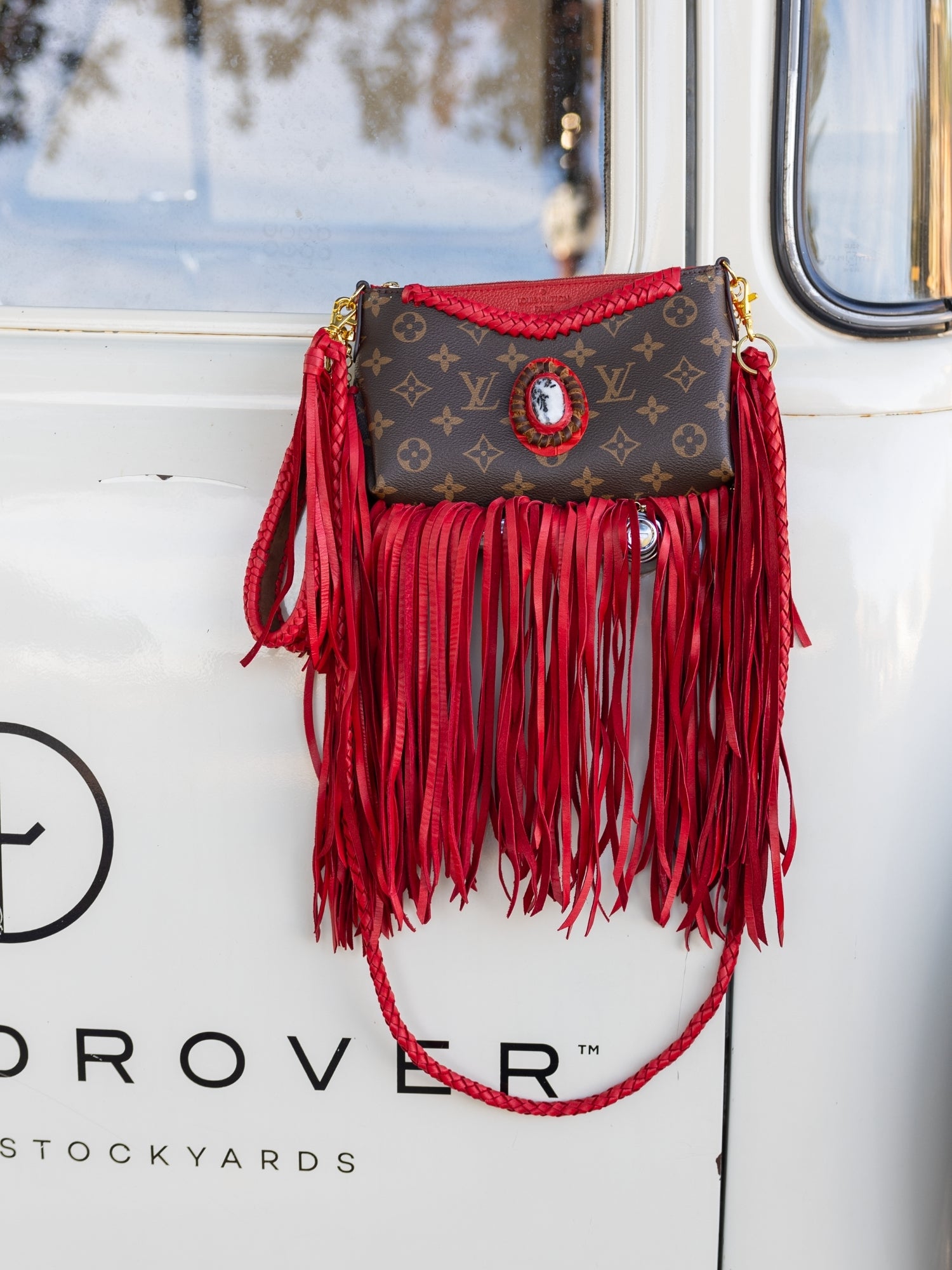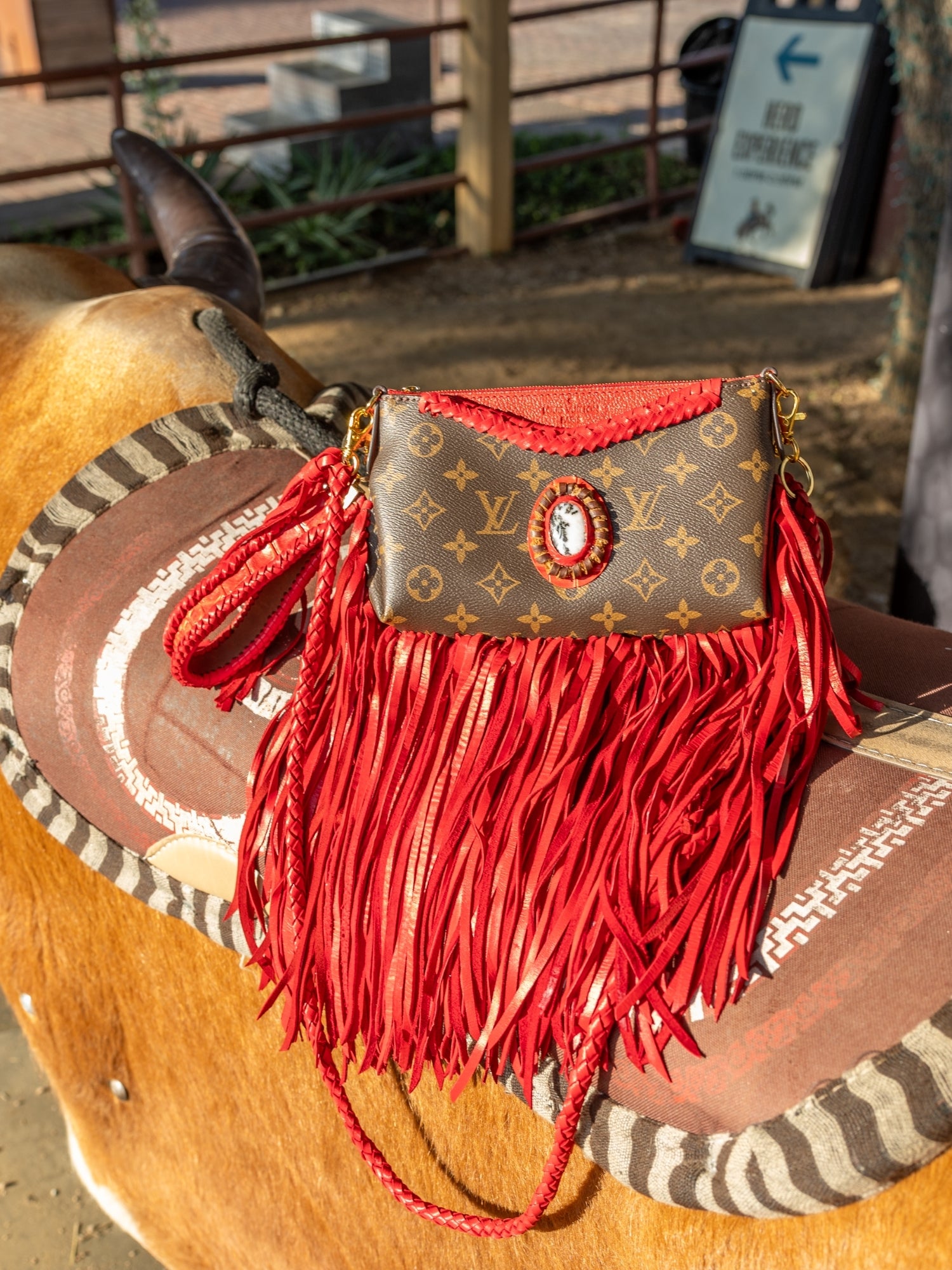 All eyes on you. The Showstopper turns heads with rich red leather fringe, a crocodile-embossed wristlet strap, and a striking White Buffalo stone centerpiece. This small crossbody seamlessly converts to a wristlet, giving you options for any occasion—from Fort Worth rodeos to nights out in the Stockyards. Every detail is handcrafted for the woman who loves to stand out with purpose and style.