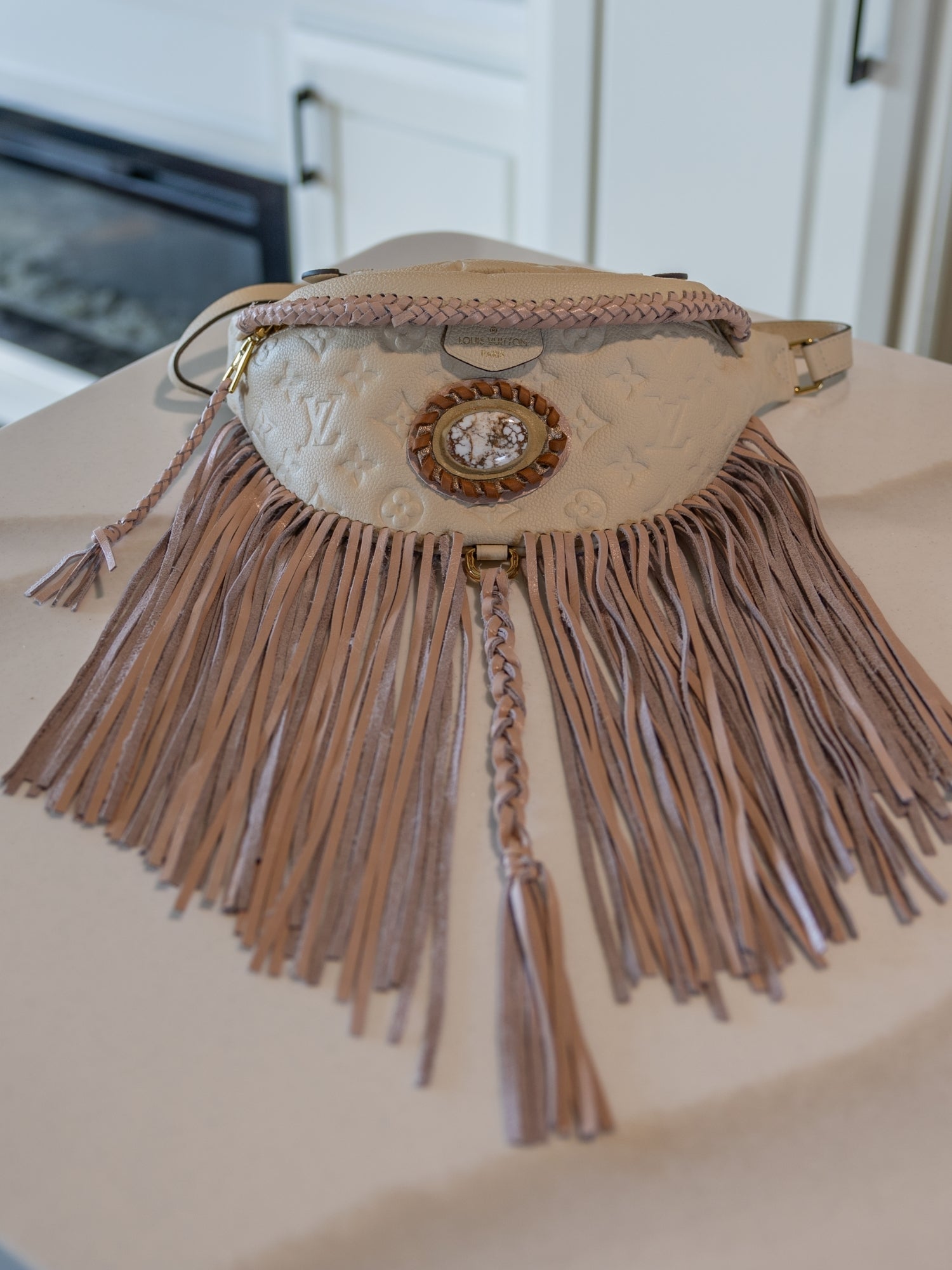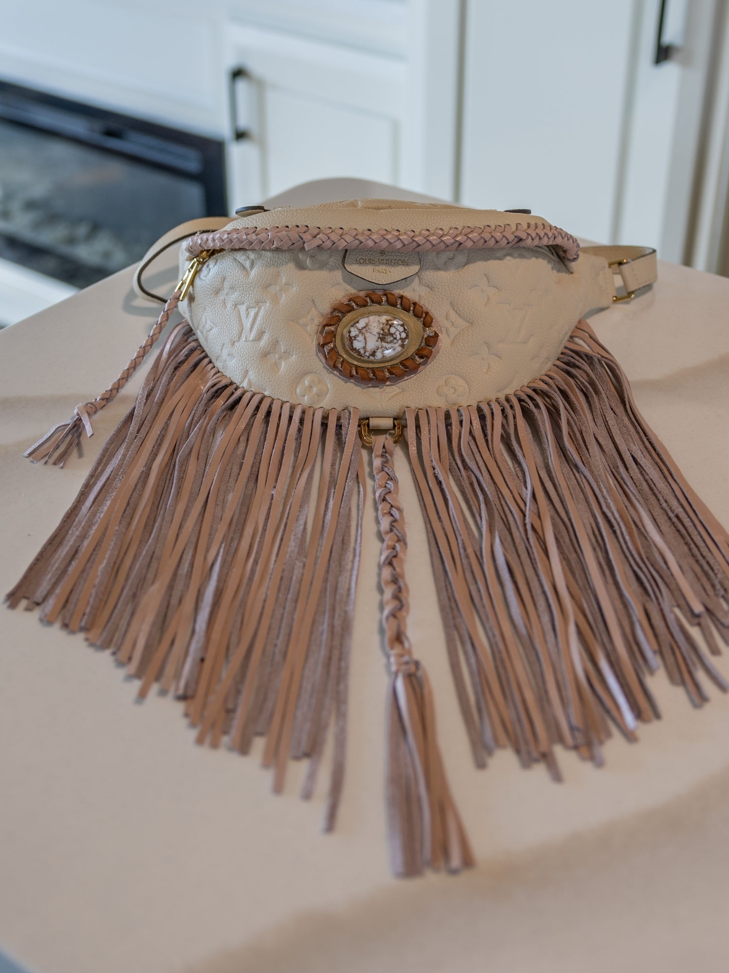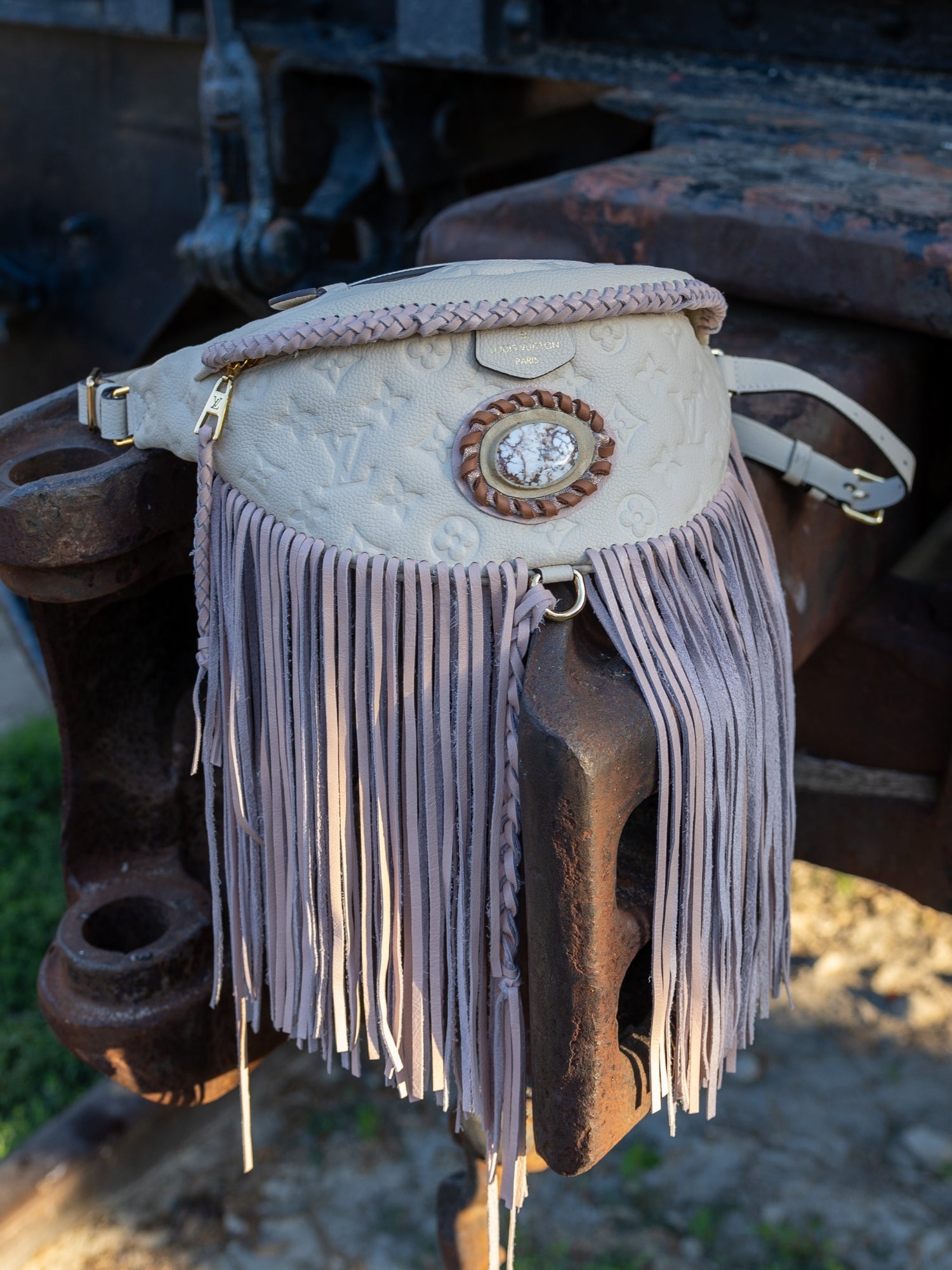 Freedom, redefined. The Outrider blends elevated design with frontier spirit, crafted from pale pink leather fringe and finished with a Crazy Horse center stone. This bumbag sits perfectly at the crossroads of fashion and function—hands-free luxury for those who lead the way. Its handcrafted detailing and subtle shimmer make it a statement piece with quiet confidence.