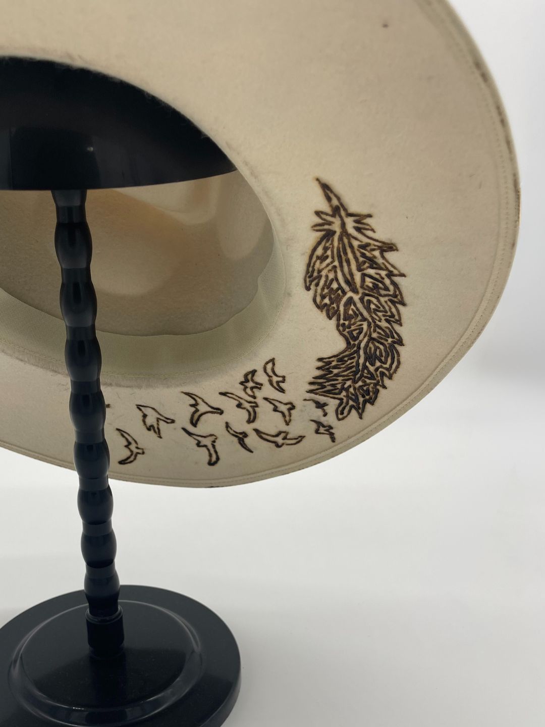 Grace with grit. The Hold My Halo hat is a handcrafted felt masterpiece that balances strength and softness in every detail. Engraved with “Hold My Halo” across the top and adorned with hand-tooled leather flowers and a leather feather, it tells the story of a woman who can pray and raise hell in the same breath. Birds and feather engravings under the brim add a quiet reminder of freedom and faith, grounding its bold spirit with beauty.