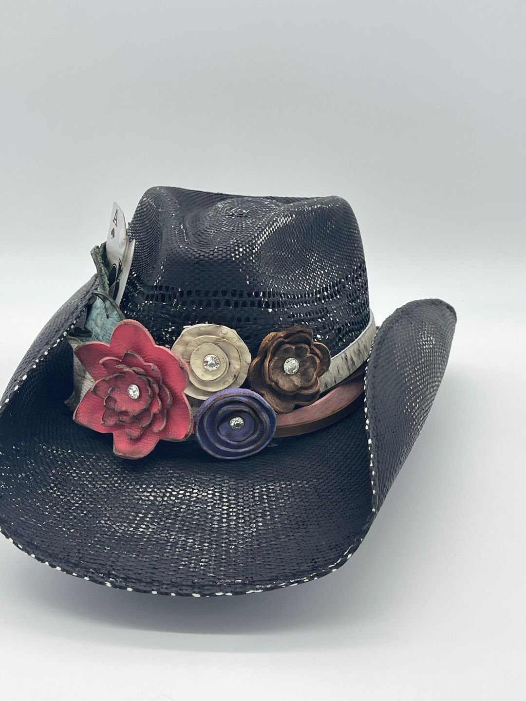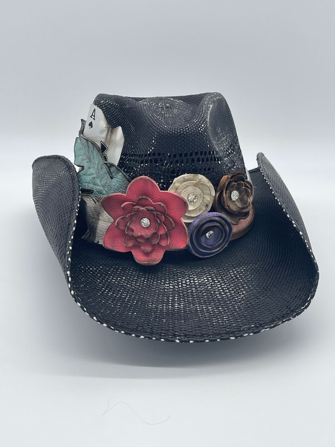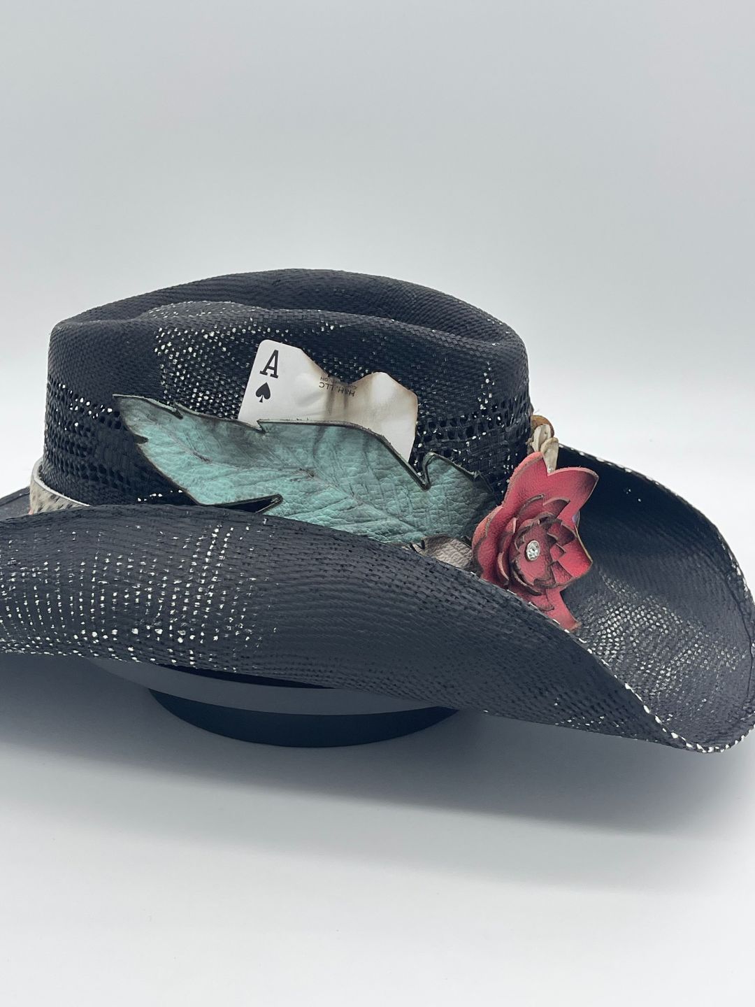 All in on originality. The Ace of Spades is a one-of-a-kind straw cowboy hat that blends bold Western energy with refined, artistic detail. Hand-styled with a genuine playing card, layered leather flowers, and a teal leather feather, this hat embodies confidence, craftsmanship, and a little bit of mischief. Perfect for those who play by their own rules—and always win the room.