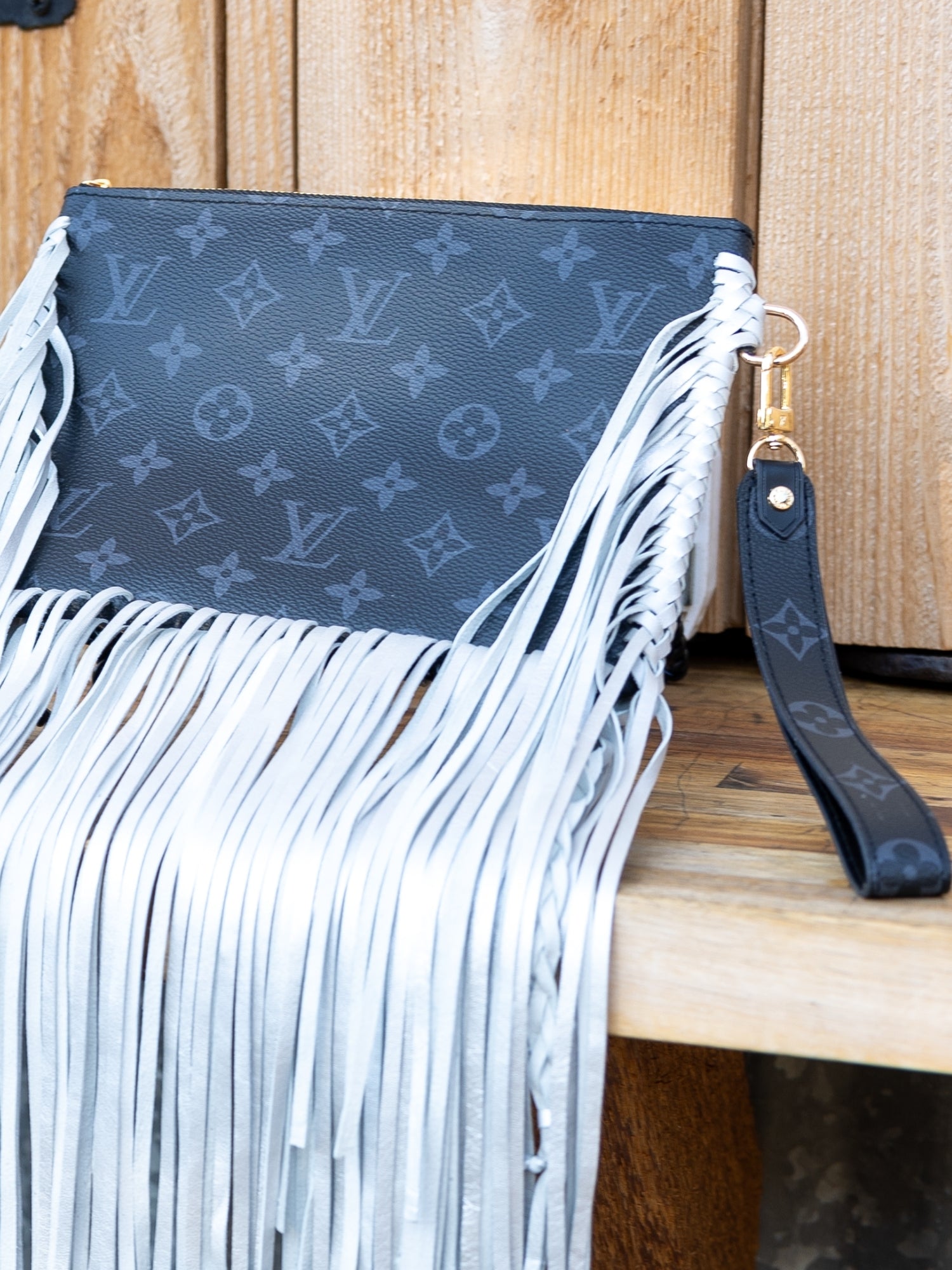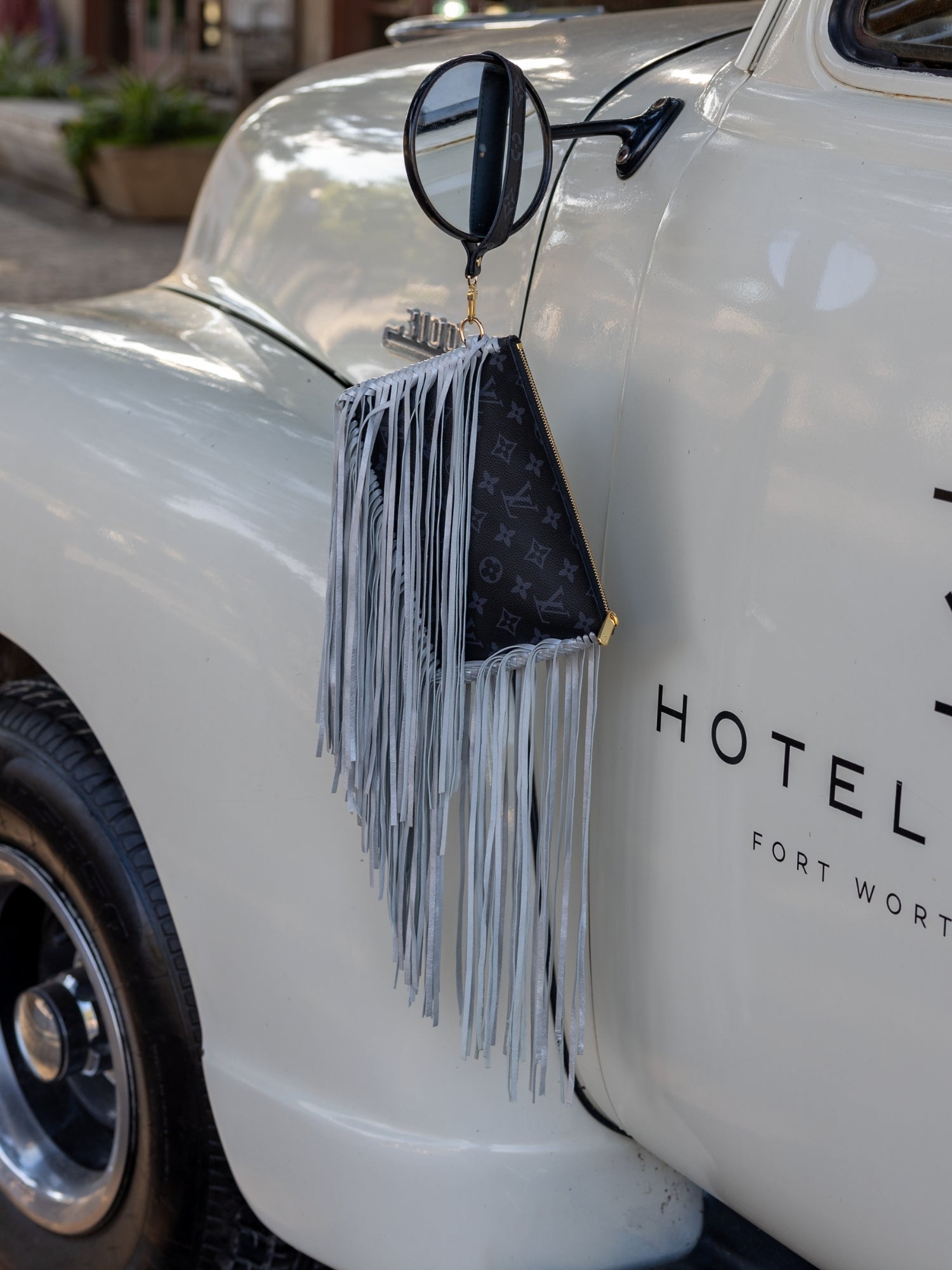 Subtle shine. Endless spirit. The Silver Star captures the effortless glow of metallic deerskin against the timeless monogram. Its soft, flowing fringe moves like moonlight, bringing a touch of modern luxury to a classic Western silhouette. Designed to carry confidence wherever you go, this wristlet blends texture, tone, and craftsmanship into one radiant piece.