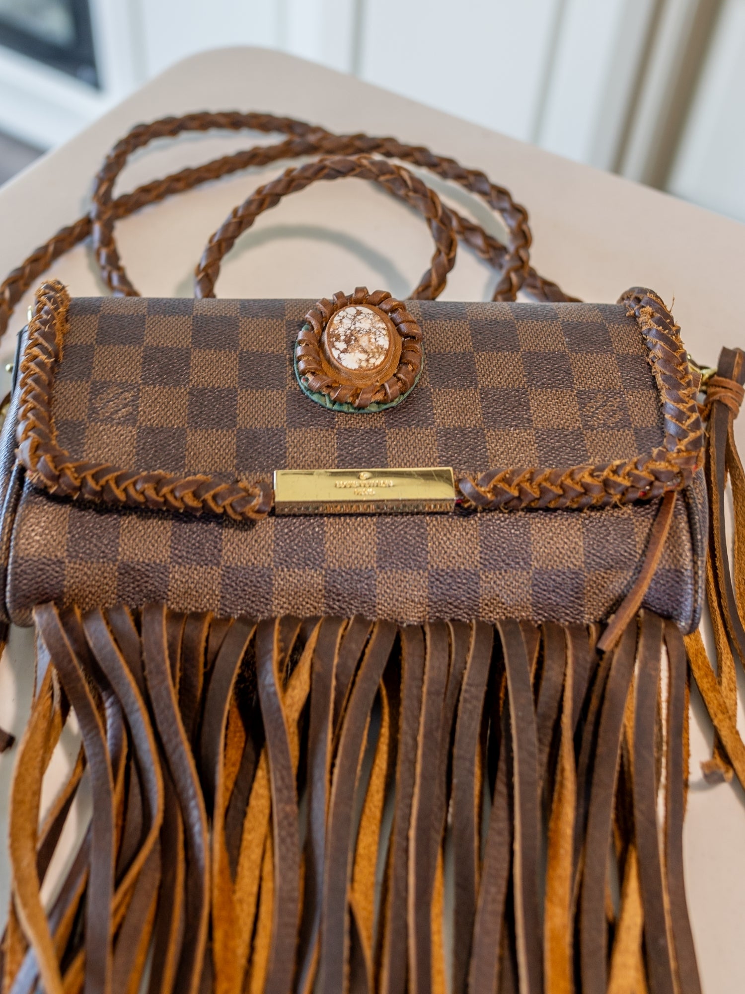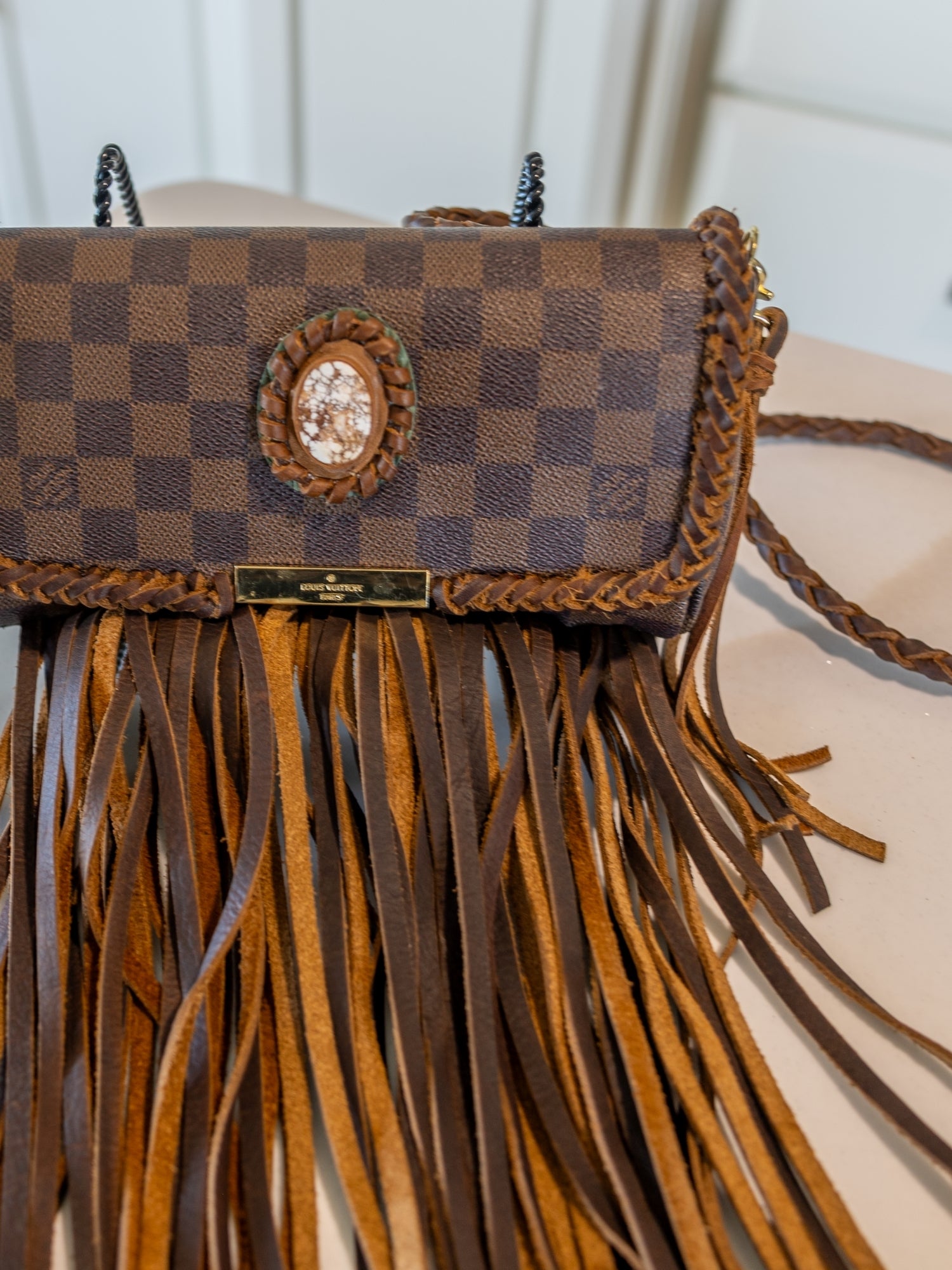 - Brown leather fringe