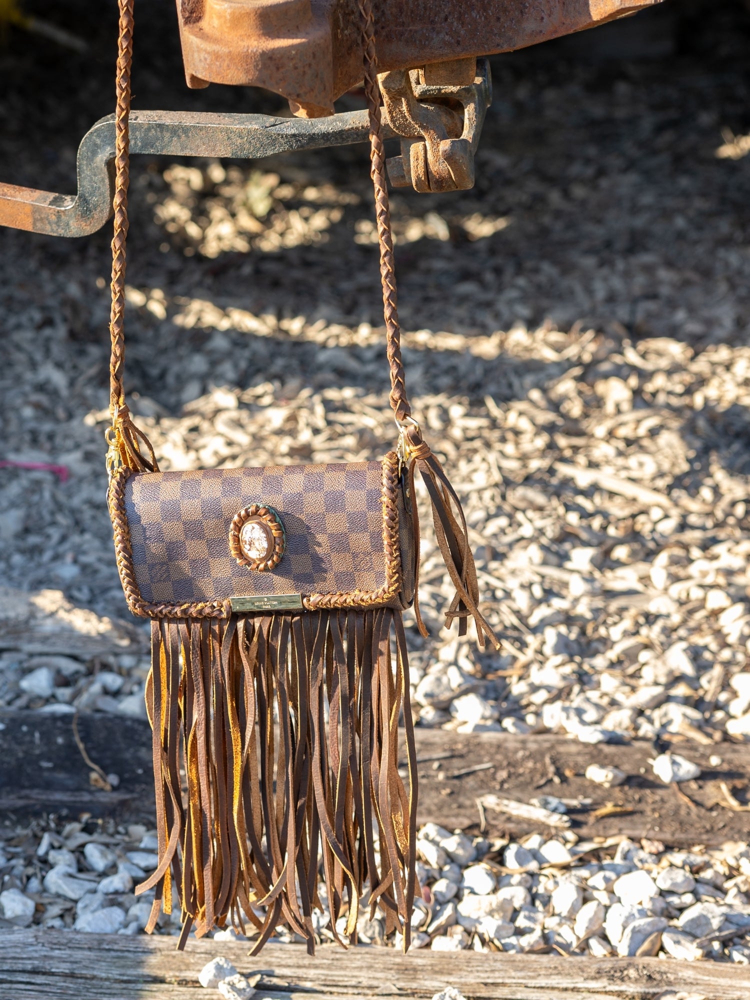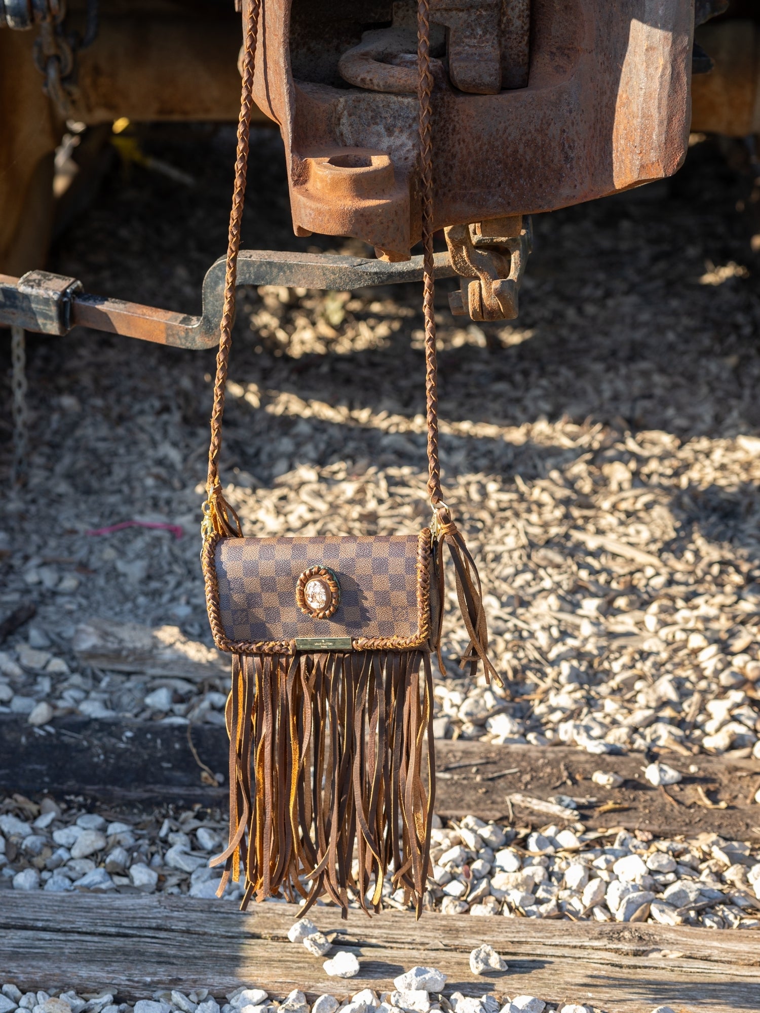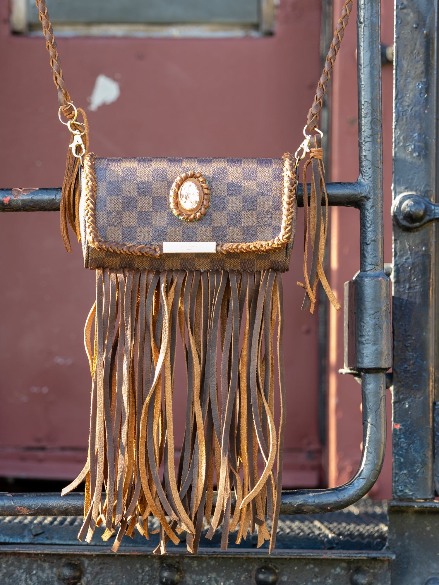 Where grit meets grace. The Outlaw is a Wallet on Chain design redefined with hand-cut brown leather fringe and a bold Crazy Horse center stone. Its rich, earthy tones and rugged elegance nod to the untamed spirit of the West, while the gold hardware and braided leather straps keep it modern and elevated. Compact yet full of character, this piece carries the soul of a saddle bag with the refinement of a night-out essential.