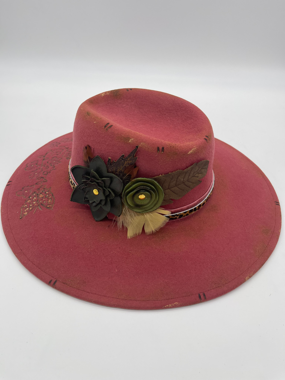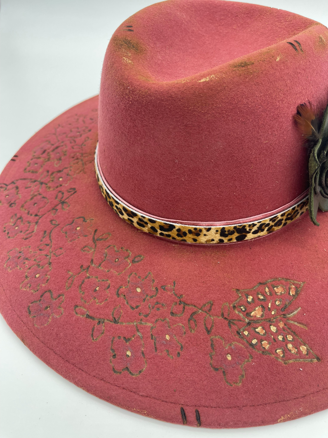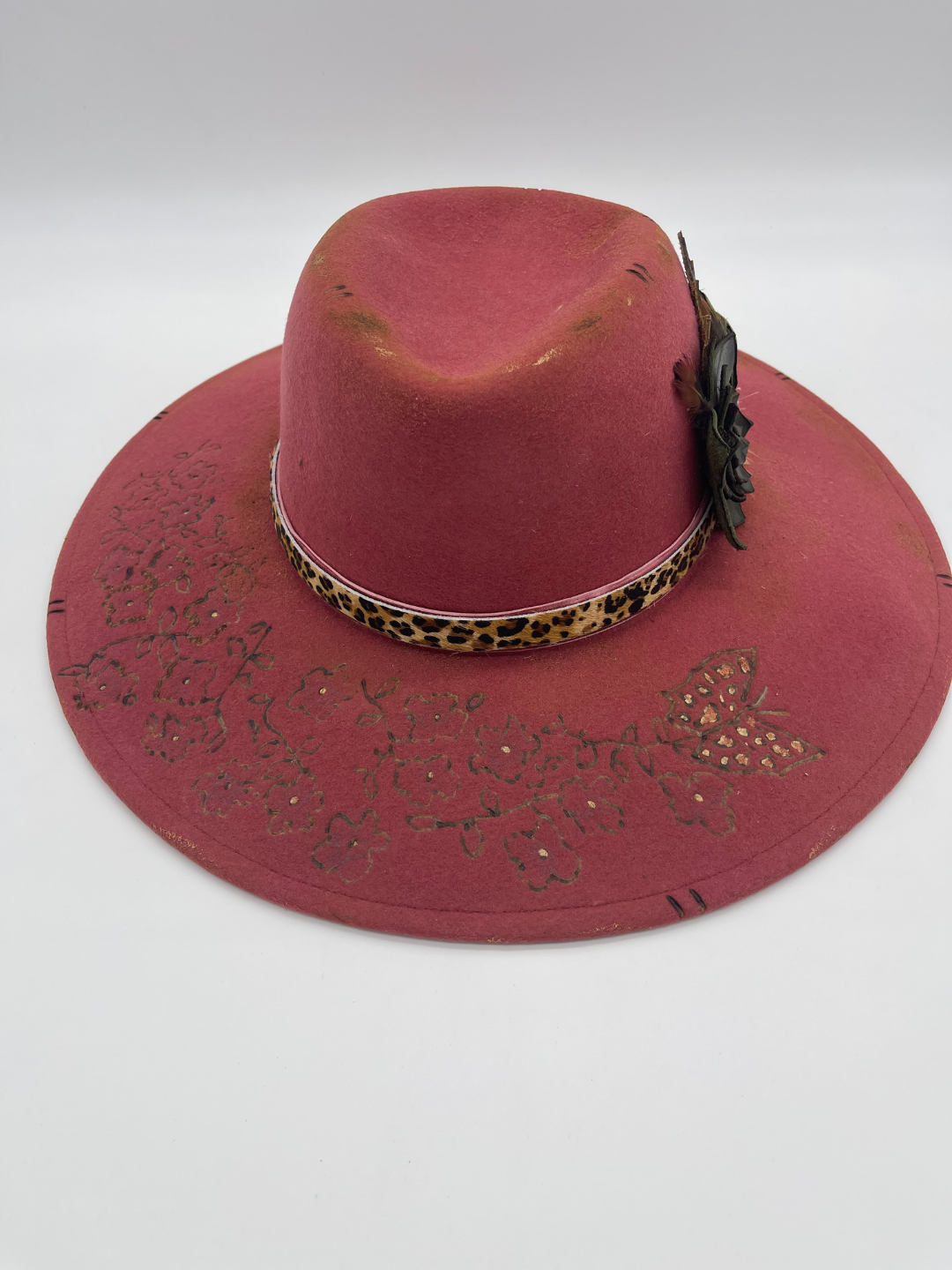 Soft beauty with a wild streak. The Wild Rose is a wide-brim felt hat that blends feminine detail with untamed Western spirit. A deep rose-pink base sets the tone, accented by leopard-print trim, layered florals, feathers, and golden touches that catch the light just right. Designed for those who walk the line between grace and grit, this statement piece brings elegance to every adventure.