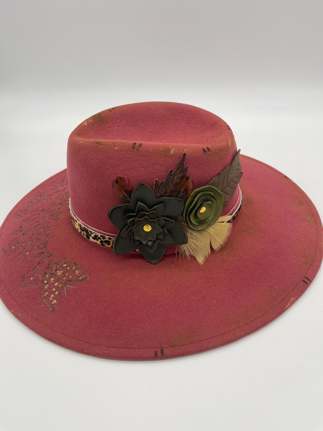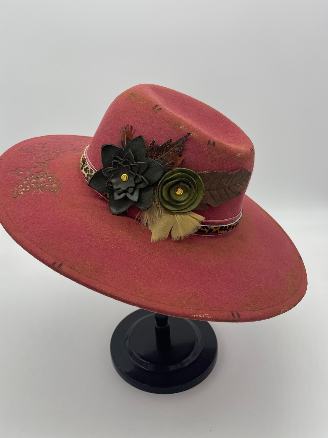 - Leopard-print hatband with floral and feather accents